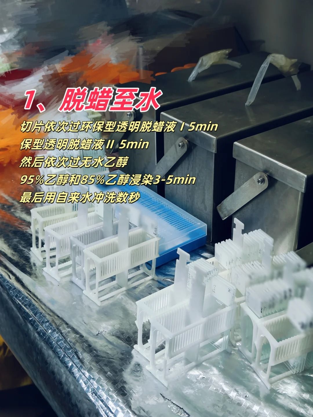 ?3)脫蠟與水化?:石蠟切片需徹底脫蠟,以防染色不均勻。水化過程要適中,確保切片充分水化但不過度。