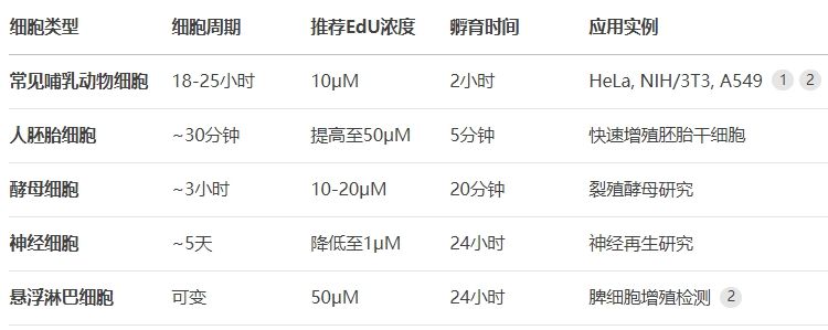 表:不同細(xì)胞類型的EdU處理參數(shù)參考