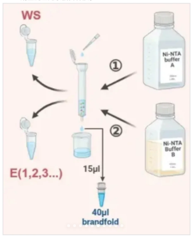 用 Ni-A 緩沖液洗去雜蛋白(收集 WS樣本),再用 Ni-B緩沖液洗脫目的蛋白(收集E樣本),通過(guò) Bradford 試劑監(jiān)測(cè)至無(wú)雜蛋白釋放。