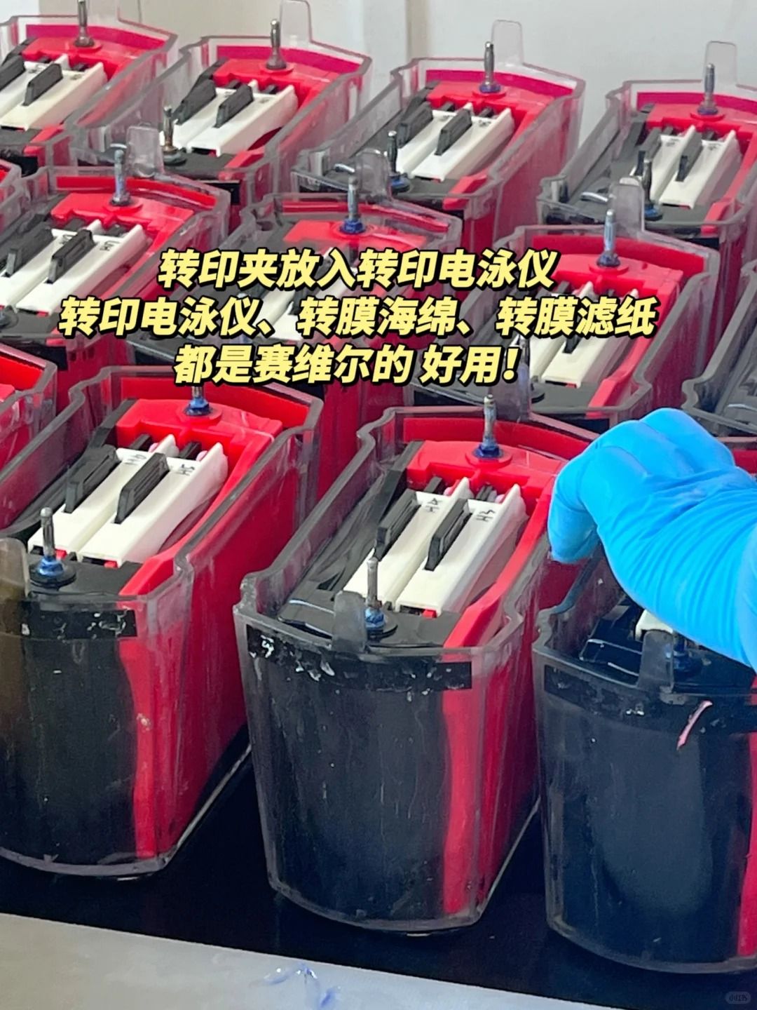 在盛有轉(zhuǎn)膜緩沖液的容器中操作,按‖正極(+,紅色面)|海綿|濾紙|膜|膠|濾紙|海綿|負(fù)極(-,黑色面)‖的順序,在轉(zhuǎn)印夾中依次放置好轉(zhuǎn)印材料。按照紅對紅,黑對黑的方向,將轉(zhuǎn)印夾放入轉(zhuǎn)印芯(轉(zhuǎn)印芯可同時(shí)放置兩塊轉(zhuǎn)印夾)