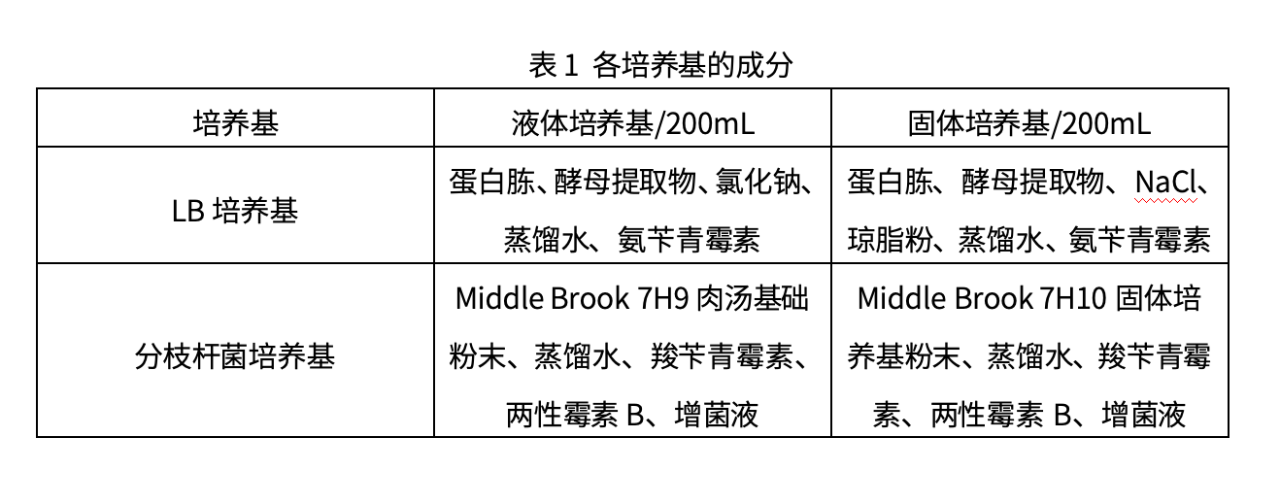 (1)培養(yǎng)基準(zhǔn)備:LB培養(yǎng)基(大腸桿菌)、Middle brook培養(yǎng)基(鳥分枝桿菌)