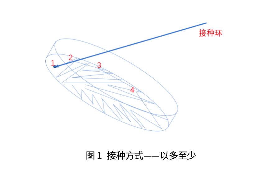 (4)活化、接種:菌種的來源可以是涂布的平板也可以是保存在-80℃的菌種。關(guān)閉紫外線,打開超凈工作臺通風(fēng),點(diǎn)燃酒精燈,將接種環(huán)放置在酒精燈上灼燒至紅色,放置在火焰周圍冷卻。挑取適量菌落或者菌液進(jìn)行劃線,使得菌液以多至少的量(圖1)分布在培養(yǎng)基表面。
