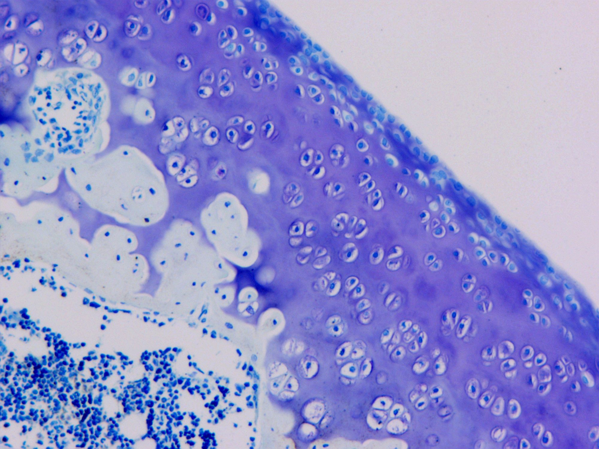 (3)1%鹽酸酒精分化至軟骨細(xì)胞呈紫藍(lán)色清楚可見;