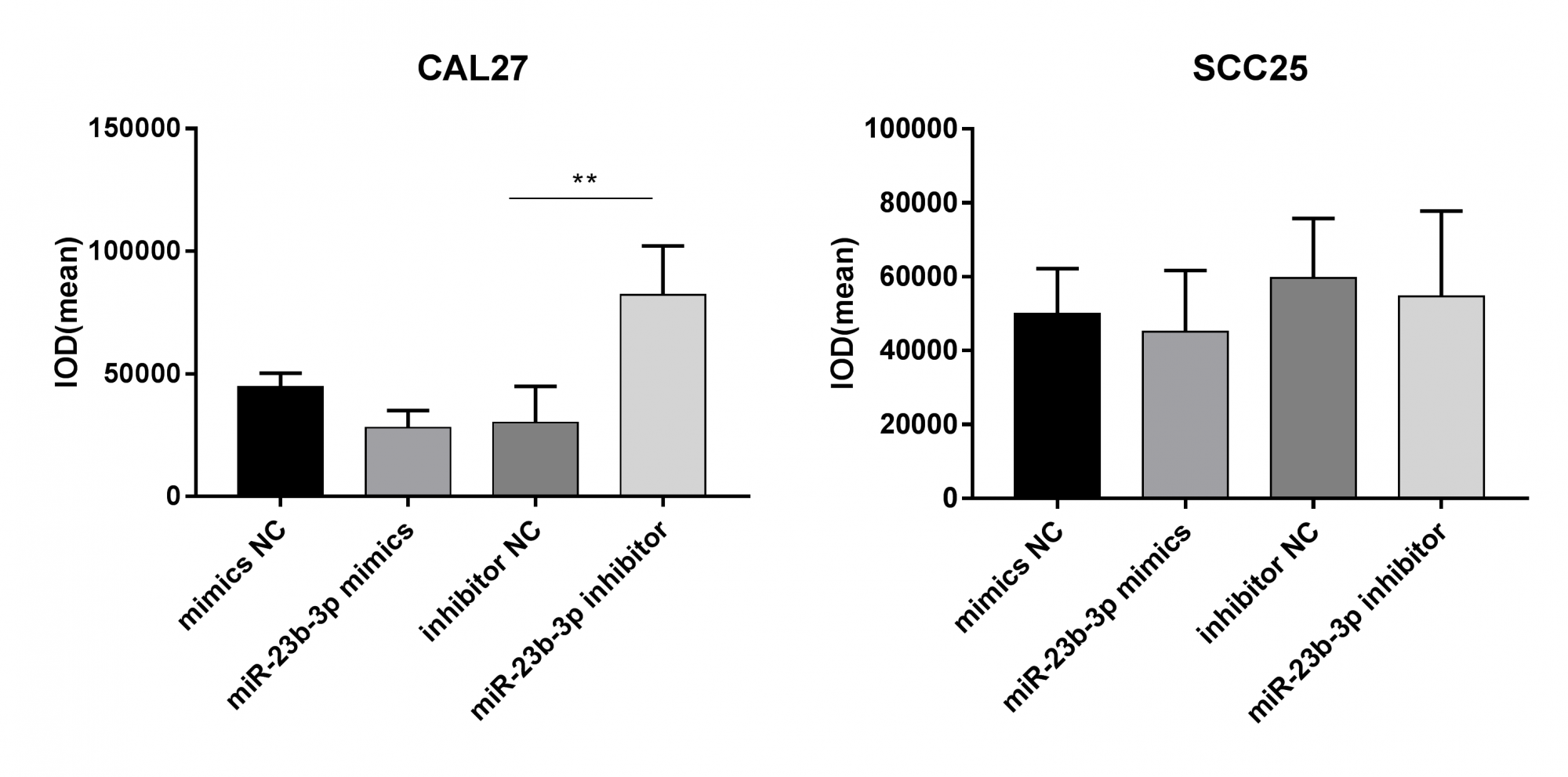 如圖所示,在CAL27細(xì)胞中,mimics NC和miR-23b-3p mimics組間無明顯差異,與inhibitorNC組相比,miR-23b-3p inhibitor組細(xì)胞增殖能力有所上調(diào);SCC25細(xì)胞各組間無明顯差異。