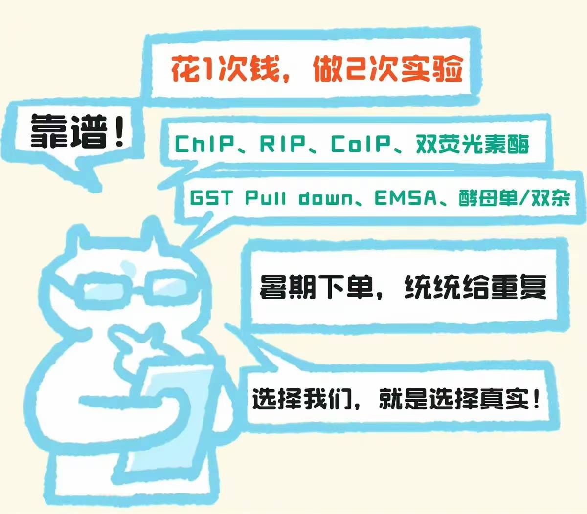 我們深刻理解數(shù)據(jù)可重復性對科研成果的重要性。本次活動中,所有下單的ChIP、RIP、CoIP、雙熒光素酶、GST Pull down、EMSA、酵母單/雙雜交等實驗服務,都將獲得重復實驗的特別保障。這意味著: