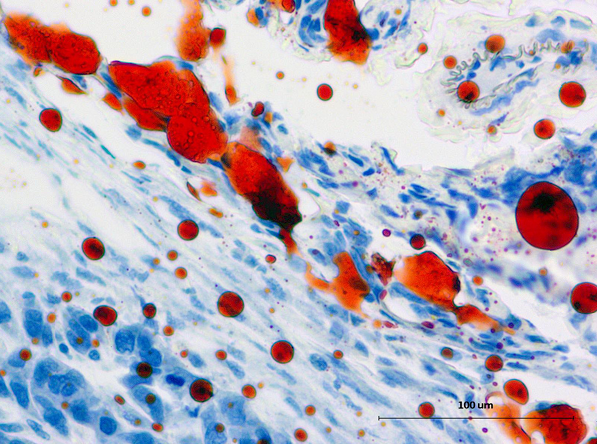 油紅O染色液主要用于顯示組織器官的脂肪變性和類脂質(zhì)的異常沉著,常發(fā)生于肝、腎、心等實質(zhì)臟器的脂肪變性,細胞內(nèi)出現(xiàn)多數(shù)中性脂肪滴;鑒別和診斷脂肪組織中所發(fā)生的腫瘤及其性質(zhì)。標本不采用含有乙醇的固定液(如需要固定可采用10%的福爾馬林)、也不采用石蠟切片,需用冰凍切片或碳蠟切片。脂肪的陽性染色結果呈橘黃至紅色,但具體顏色因脂質(zhì)濃度而定。