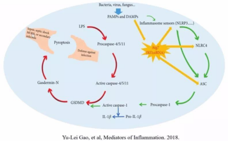 在病原體感染時,適度的細胞焦亡可清除致病微生物,而過度的細胞焦亡在導(dǎo)致細胞死亡的同時,釋放炎癥因子,擴大炎癥反應(yīng),造成發(fā)熱,低血壓、敗血癥等癥狀。以敗血癥為例,敗血癥是由致病菌侵入血液系統(tǒng),并在其中生長繁殖,產(chǎn)生毒素,引起全身性感染,最新研究表明,細胞自噬相關(guān)基因Atq7沉默后,可激活細胞焦亡途徑。