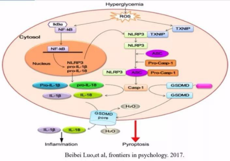 1、因代謝障礙或代謝旺盛等原因引起的疾病稱為代謝性疾病,常見的有糖尿病、痛風(fēng)、糖尿病性心肌病等。以糖尿病性心肌病為例,由心肌細胞死廣引起,最新的研究顯示高血糖可以造成活性氧的產(chǎn)生增加,進而上調(diào)NF-KB和TXNIP,NF-KB又可以上調(diào)NLRP3IL-1B前體以及IL-18前體的表達:TXNIP通過改變NLRP3的結(jié)構(gòu)激活Caspase-1活化的Caspase-1-方面切割GasderminD,形成含有GasderminD氮端活性域的肽段,誘導(dǎo)心肌細胞膜穿孔、破裂,釋放內(nèi)容物,引起炎癥反應(yīng);另一方面,活化的Caspase-1對IL-1β和IL-18的前體進行切割,形成有活性的IL-1β和IL-18,并釋放到胞外,募集炎癥細胞聚集,擴大炎癥反應(yīng)。