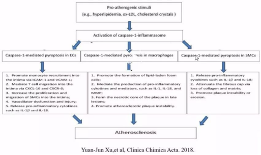 1、在動脈粥樣硬化的發(fā)展中,炎癥被認為是啟動和驅(qū)動動脈粥樣硬化的主要因素。在高血脂,氧化修飾的低密度脂蛋白等幾次下,激活Caspase-1,介導(dǎo)血管內(nèi)皮細胞,巨噬細胞,血管平滑肌細胞的焦亡與炎癥反應(yīng),導(dǎo)致血管擴張功能障礙、壞死中心的形成,粥樣硬化斑塊的穩(wěn)定,最終造成動脈粥樣硬化。
