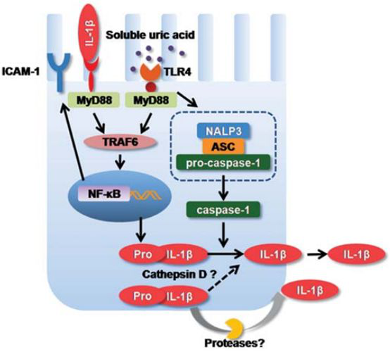 (3)晶體相關(guān)性腎病研究發(fā)現(xiàn)以含100ug/mL尿酸培養(yǎng)液培養(yǎng)腎小管上皮細胞發(fā)現(xiàn)TLR4 NLRP3、Caspase-1IL-1?表達的增加,予以TLR4的阻滯劑TAK242干預(yù)后NLRP3 Caspase-1IL-1的表達明顯減少,說明尿酸可通過TLR4激活NLRP3及下游焦亡信號因子,導(dǎo)致腎臟炎癥反應(yīng)及細胞焦亡。參考文獻:Soluble uric acid increases NALP3 inflammasome and interleukin-1βexpression in human primary renal proximaltubule epithelial cells through the Toll-like receptor 4- mediated pathway.