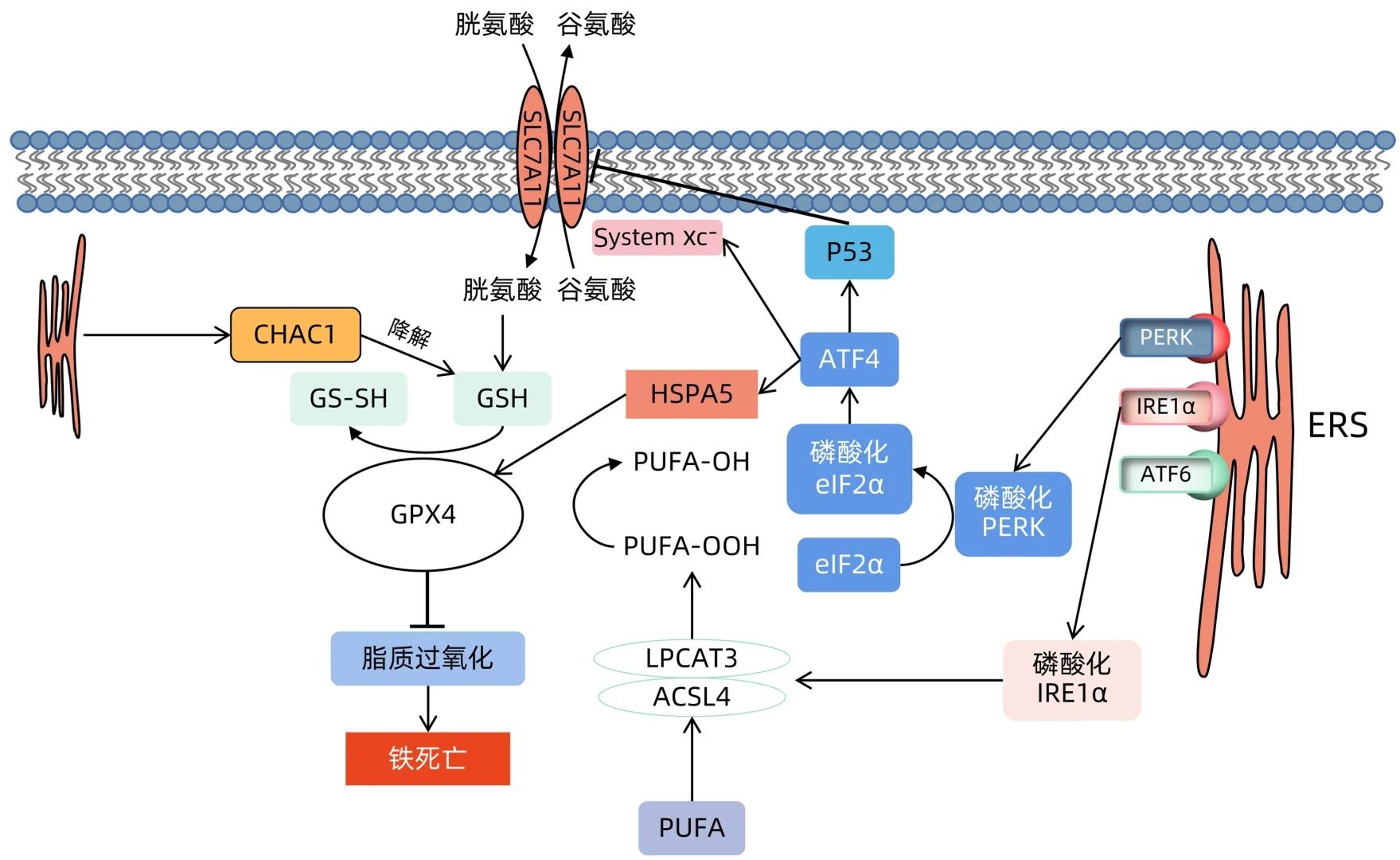 相比之下,?細胞鐵死亡?是一種鐵依賴性的細胞死亡方式,主要由脂質過氧化驅動。在二價鐵離子或酯氧合酶的作用下,細胞膜上的高表達不飽和脂肪酸發(fā)生脂質過氧化,導致細胞死亡。